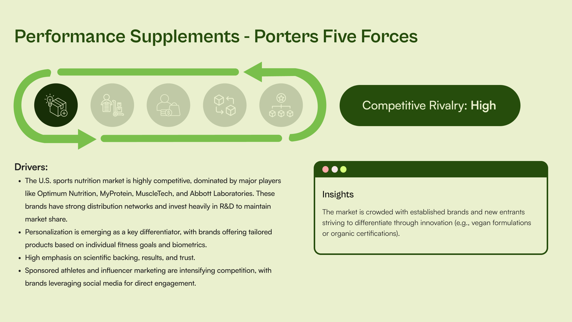 Through Porter’s Five Forces analysis and competitor benchmarking, we identified a "Blue Ocean" opportunity between generic retail supplements and expensive, slow-delivery custom kits.