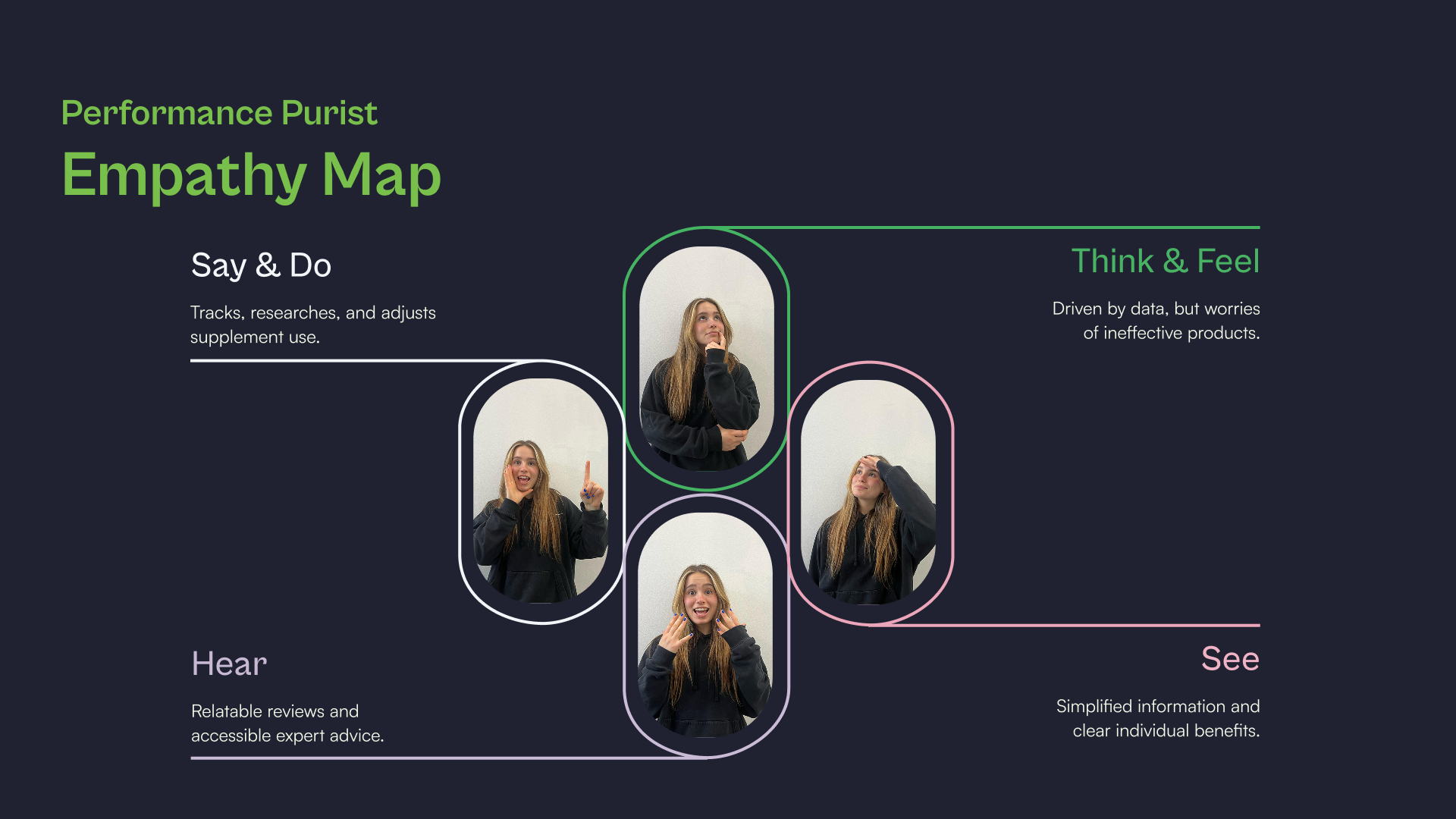 Through surveys with 110+ participants and in-depth interviews, we synthesized four key user archetypes. We focused our design and testing on two primary groups: the detail-oriented 'Performance Purist' and the curious 'Pragmatic Experimenter'. User insights drove the evolution of our value proposition, shifting from 'Convenience' to 'Adaptability'.